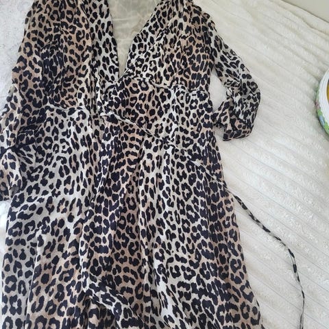 Kjole fra Ganni i silke. Leopardmønstret. Str. 32 men stor i størrelsen og med strech og passer en xs-s. Veldig flatterende på:) Helt ny med tag. Aldri brukt. Kjøpt på Me And My Cousin på CC-vest. Nypris: 3200 kr.