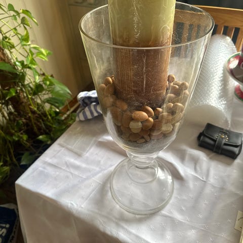 Stort gravlys i glass. Brukt til en halloweenfest, så den er veldig lite brukt, max 4 timer brukt, selges 50 kr