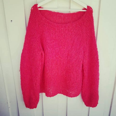 Kjempe myk og deilig genser som er strikket i to tråder silk mohair fra drops. Veldig fin varm rød. Den går fin å ha rett på kroppen for den er så myk og stikker ikke. Den har A-fasong og rillestrikk på brystet.Den er bare brukt noen få ganger og ikke vasket, bare luftet. Den er luftig så den er fin å ha inne da den ikke er så varm. Mamma har heklet på kanten i halsen, nede og på armene så det ser veldig fint ut.