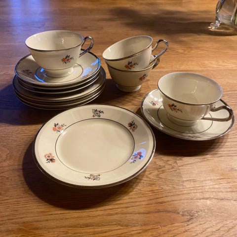 Lekkert PP gammelt/vintage, veldig pent. Kom gjerne med bud. Selges samlet. Kaffekanne, sukker- og fløte-sett og 9 tallerkner.