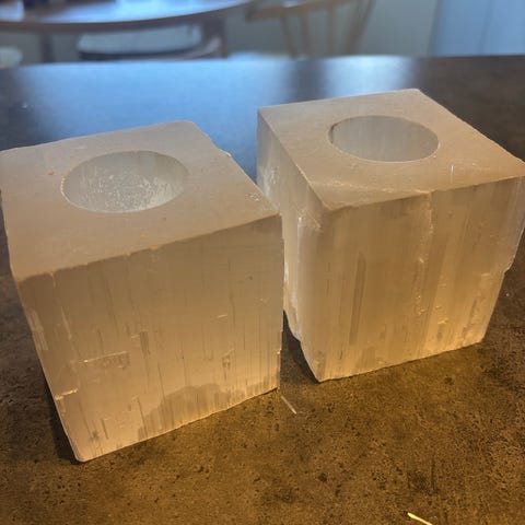 Selger disse flotte telysholdere I Selenitt.De er Kjøpt på Slettvoll Skøyenåsen for noen år siden.Benyttet ifm styling av et hus.