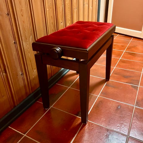 Fin pianokrakk i mørkt tre med sort trekk.