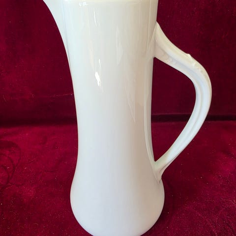 Hvit porselensmugge fra Vebjørn Sand. Pingvinmotiv foran. Sølvkanten på toppen er noe slitt, og den er noe krakelert under helletuten. Se eget bilde. Den rommer 1,5 liter og er 28,7 cm høy.