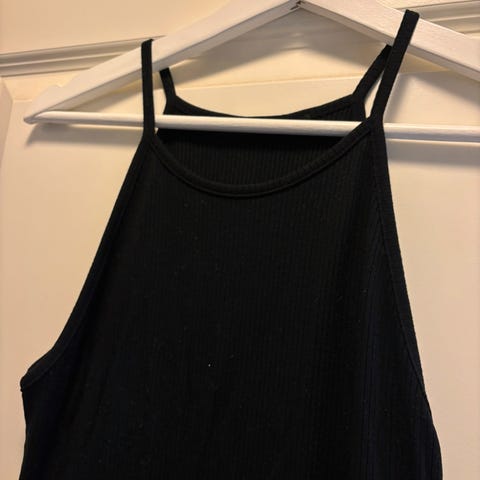 Liten splitt nederst på hver side, Halterneck utringing, mye stretch og myk tekstil.