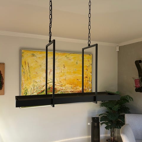 Helt ny lampe som ble kjøpt på Lampegiganten til 3000,-. Den ble montert, men passet ikke inn, så den ble tatt ned igjen. Jeg ser den har fått en liten skade på hjørnet på den boksen som går opp mot taket i forbindelse med demontering, og den selges derfor billig (se bilde).
