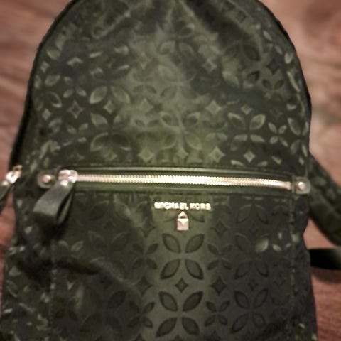 Fargen er blå/navy, med sort detaljer. Stoffet ligner nylon som er på prada bags. Og detaljene i sort er skinn.