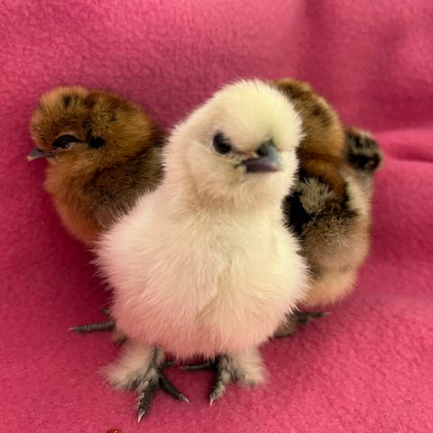 Bilder er av foreldre og tidligere klekkede kyllinger. Kyllinger som klekkes nå, vil være i ulike lyse farger, paint, beige og brunsort.