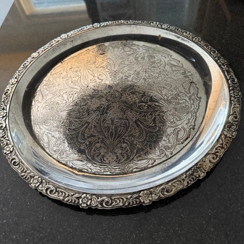 Nydelig ,massivt stort fat med flotte detaljer . 44 cm i diameter. Vet ikke opprinnelsen,finner ingen stempler. Kan sendes mot porto 69kr.