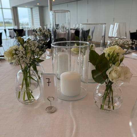 Selger flere små glassvaser som er brukt til dekorasjon i en dåp. Kan fint brukes til pynt på jubileum, fest, bursdag og bryllup. Eller til sommerblomster i stua.