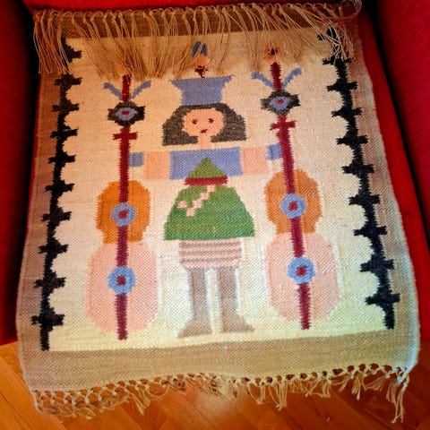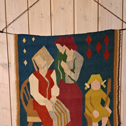 Hånd vevd lite vegg teppe . H 54 cm . B 39 cm . Like fint på begge sider .