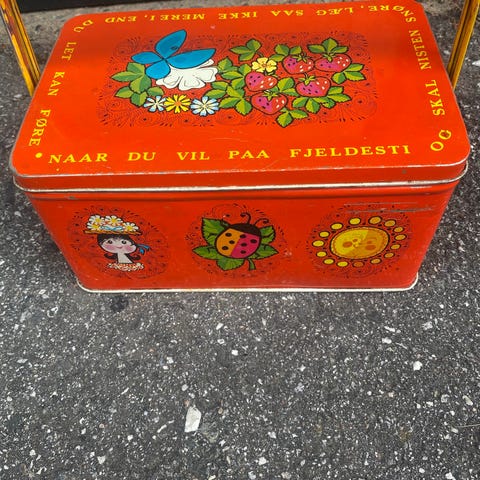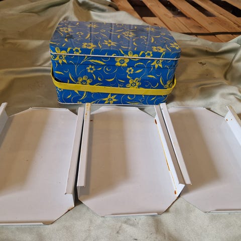 Retro Vintage lunch/mat boks m flere etasje brett selges. Tror den er fra 70 tallet eller tidligere.Se fotos for tilstand og detaljer .Bruksspor og små bulker, enkelte avskallinger mm. Kan hentes hos meg i Oslo, eller sendes i posten/post nord fra 65kr-139kr