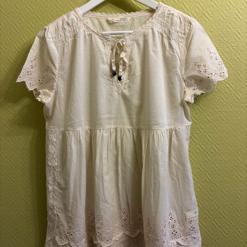 Helt ubrukt Odd Molly topp i str 3 selges. Den er god på størrelsen og er mer mot en XL. Nydelig rødrosa farge. Broderie anglaise over det hele. Spennende detaljer; som knyting i ryggen og strikk i halsringningen slik at den kan trekkes ned over skuldrene. Løs singlet undertrøye med mulighet for justering av stropplengden. Stroppene kan festes i toppen med trykknapp (se bilder).