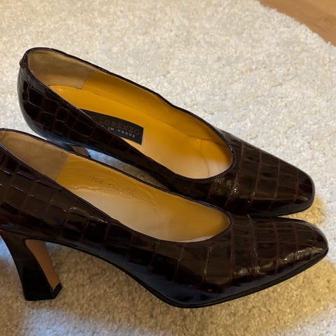 CHELLIS Venezia pensko, str 39,5, sort semsket skinn på mesteparten av skoen, tuppen og hælen er av annet skinn, gull farget innvendig.