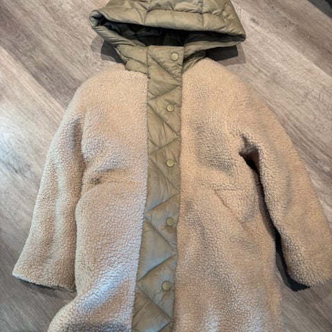 Søt og bløt mørk grå teddyjakke + vaffelmønster ca str 134. Litt usikker (har målt med en annen), det er ikke noe lapp på den. Mener den er kjøpt på Zara, og den kan brukes begge veier (derfor ingen lapp).