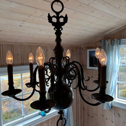 Selger denne fine lyskronen fra Høvik lys med en omkrets på ca. 65 cm. Lampen er også fin med lampeskjermer på.