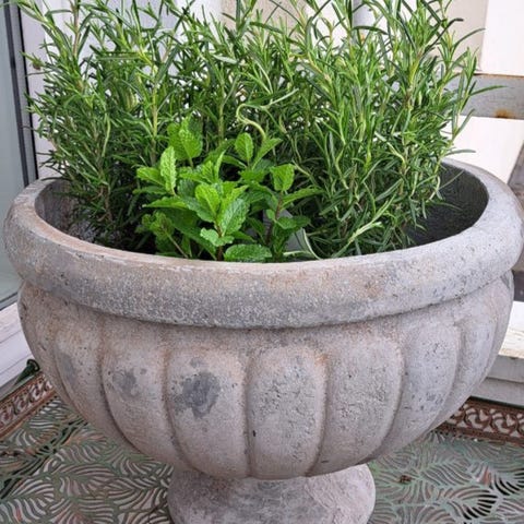 En nydelig gammel urne i blå og hvit dekor, sommerlig og fin, selges for 800 kr.