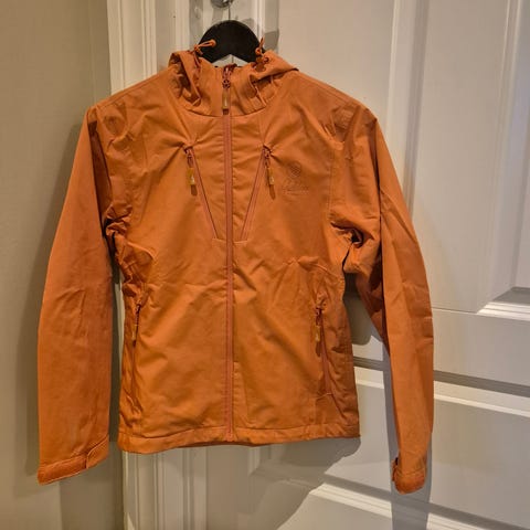 Pent brukt Elle regnjakke i str. 10 år. Det er et lite hvitt merke på det mørkeblå nederst på midten bak, se de to siste bildene.