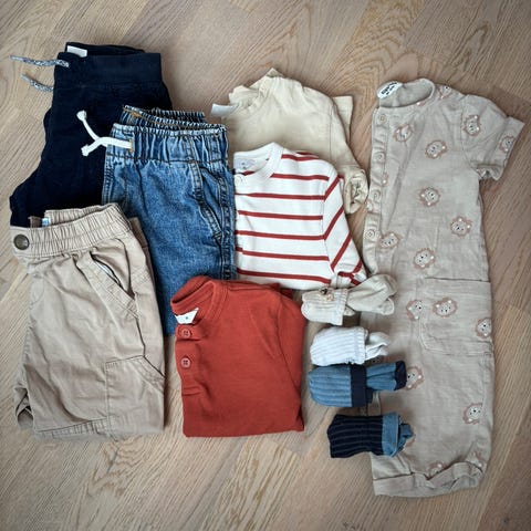 Klespakke med 13 plagg. Merker som KappAhl, HM, Newbie, little dreamer, United colors of benetton, little Mountain (sparkebuksen, den er med 30 % merino ull) og gullkorn design.