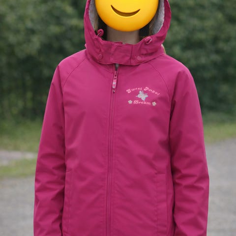 Allværsjakke med liten hest brodert foran. VENDBAR, med fleece inni. Refleks på begge sider, også bak og foran, innvendig og utvendig. Skrålommer med glidelås både innvendig og utvendig. Hette brettet inni kraven med glidelås. Hempe for henging av jakken på krok. Ypperlig til ridning, men også til allsidig bruk. Lett og behagelig å ha på. Laget i Storbritannia.