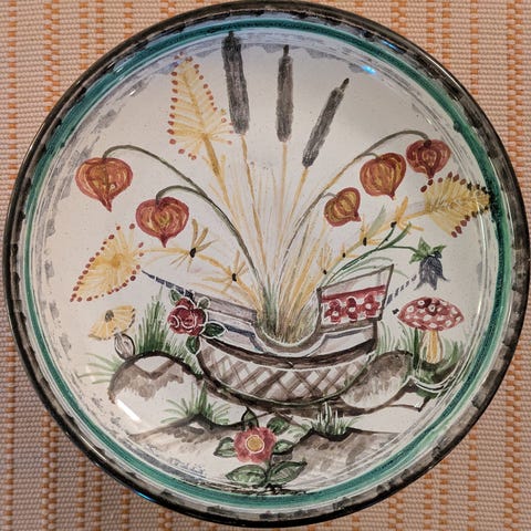 I keramikk tror jeg. Måler 27 cm x 7 cm. Har en liten stett.