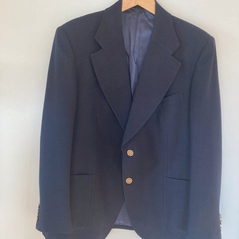 Mørke blå dressjakke med grå bukse. Usikker på størrelsen, men midje 91 og ben 79.