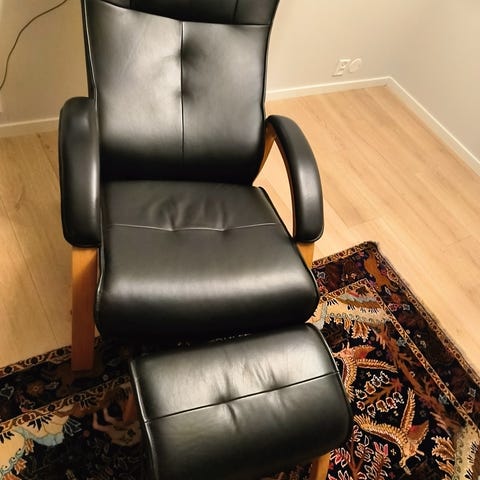 Svart skinnstol med puff fra BoConcept selges. Stolen er pent holdt og fremstår som lite brukt.