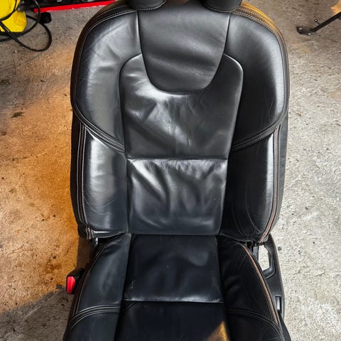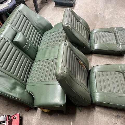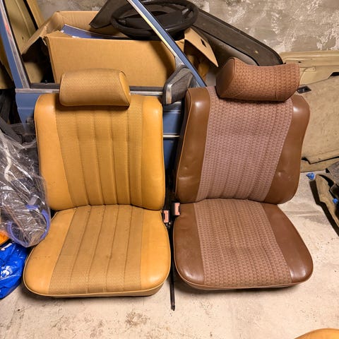 Har baksete ( sittepute) til 2 dørs, er helt å fint, og begge lommene i dørene alt i mørke blått, har også høyere sidevindu med list ( farvet glass ) alt for 1600,-