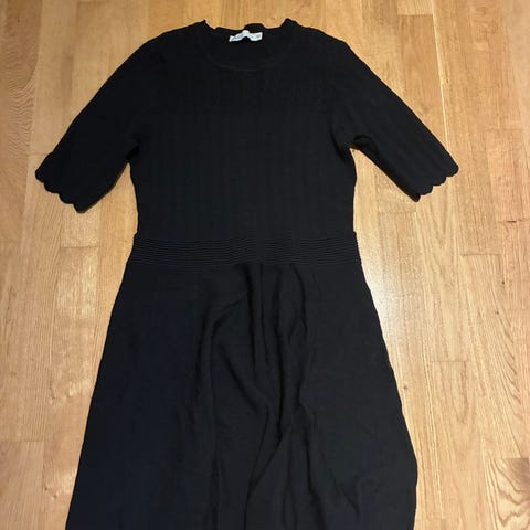 Kjole med kjempefint snitt! Stødig stoff, med underkjole. Går rett over knær på person som er 1.70cm. Glidelås ganske langt ned på ryggen gjør at den sitter veldig fint på.