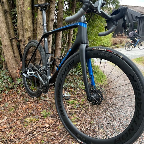Jeg selger nå for kr. 35.000, med alu hjulsett. Ønsker du også mitt konkurranse hjulsett så kan dette også kjøpes for 14.000kr. (Bontrager Aeolus RSL 62 TLR Disc landeveishjul)