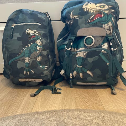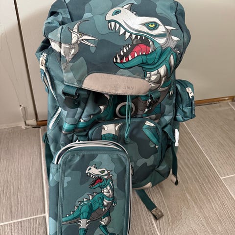 Skulesekk brukt fra 1 til 3 klasse. Noke slitt, men heil og alt virker som det skal (ikkje lyset ved lokket). Originalt regntrekk følger med.