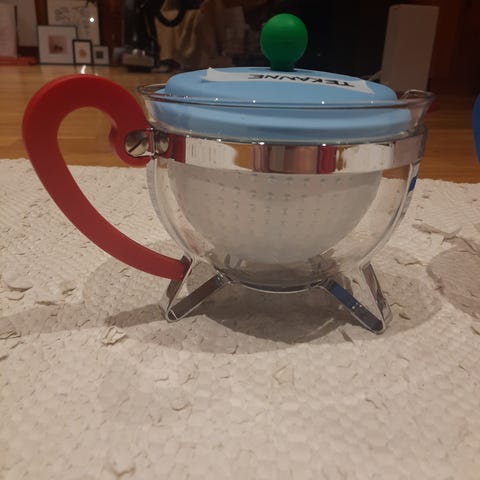 Har praktisk lokk for å sette under silen når teen er ferdig trukket.