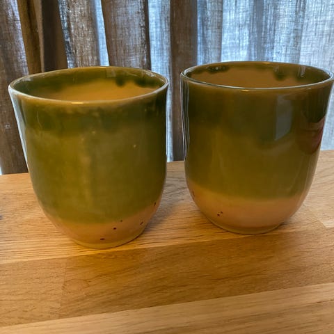 Pent brukte kaffekopper fra Rice. En blå en grønn. Kr 100 pr stk.