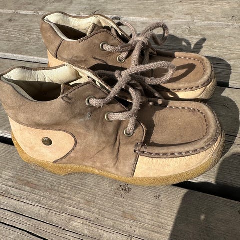 Tods er mest kjent for sine komfortable loafers til damer og herrer, men lager også mini varianter til barn. Skinn innvendig og utvendig, gummiert såle med de karakteristiske knottene. Str 25. Meget pent brukt.