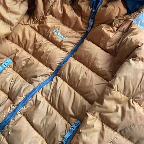 Mye brukt Bergans Lervik jakke størrelse 128. Noen slitasjemerker, blant annet nederst på jakka. Dette er vist på et bilde. Bergans-merke på arm er også nesten slitt bort. Glidelåsen er litt vrang, men fortsatt mye bruk igjen.