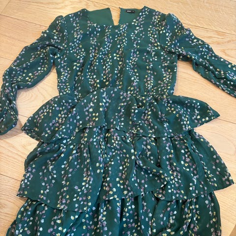 Fine detaljer med dobbelt skjørt, åpning i hals og splitt med lukking liten knapp, se bilde 1, 2 og 3.