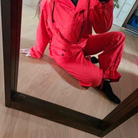Pent brukt rød parkdress fra Stormberg til dame. Jeg har brukt den kanskje fem ganger totalt. Den er litt for liten for meg. Vanntett.