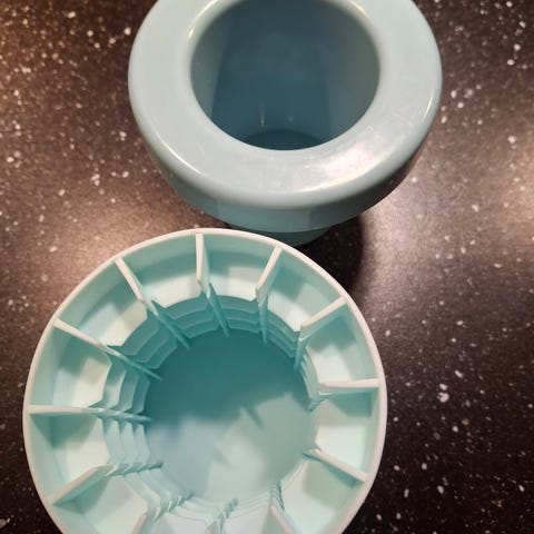 Boks til isbiter med former til å fryse isbiter. Kun et lite trykk så faller isbitene ned i boksen som holder de frosne lenge.