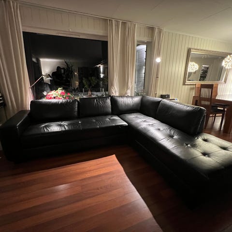 Vi skal endre stue/kjøkken, og favorittsofaen passer dessverre ikke lenger. Dette er en unik, mørk lilla skinnsofa, med armlene som kan flyttes. Sofaen er god å sitte i, og er fremdeles fon, selv om det er kommet noen bruksmerker. Har behandlet den jevnlig med skinnprodukter. Sofaen kan deles i tre for transport.