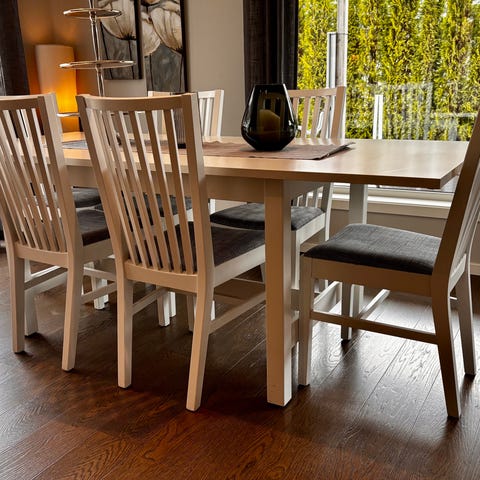Spisebord og 4 stoler(NB 2 stoler er solgt slik at det er 4 stoler + bord fra serien Cornwall. FSC godkjent/ resirkulert tre. Stol sittehøyde 50cm/rygghøyde 100cm, setebredde 48cm og setedybde 41cm. Bordet har en ekstra plate som er festet i bordet tilsvarende 40cm slik at full lengde kan bli 180cm.
