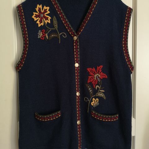 Selger tre helt nye tovede vester «Rimfrost» fra Gudrun Sjøden i str. L. 100% tovet ull. Offwhite, ( natur), mørkeblå og svart. Fargen på vesten i natur er mye lysere enn på bildet.,