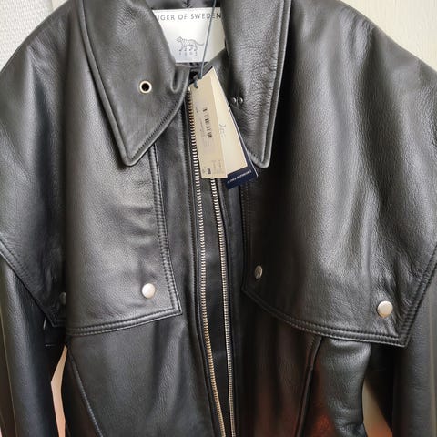 Tiger of Sweden har mest solgte skinnjakker. Den lekker, flott jakke i bløtt lammeskinn ble kjøpt for 8000 kr i Stockholm. Dessverre passer ikke nå.