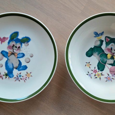 Kamla fruktfat 8 stk med stort serveringsfat. Kamla er produsert i Tyskland og fatene er fra ca 1980. Fruktfatene måler 19 cm i diameter og det store fatet måler 30cm i diameter. Selges samlet