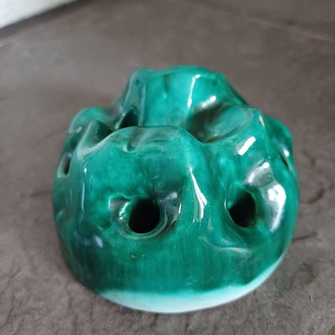 Fin gammel blomsterspreder med dame. Tror det er Uppsala Ekeby som har laget den. Den er ca 15cm høy og har diameter nederst på 10cm. Ingen skader men noen bruksmerker.