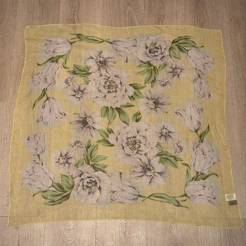 Stort og mykt skjerf i dus grønn farge med kvite stjerner. Ingen skikkelige frynser, sjå bilde nr 5.