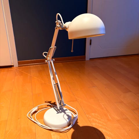 Hvit vintage Cumulus bordlampe vurderes solgt. Fra Ideas. Designer: Jan Erik Lindgren, tidligere designer for Ekornes.
