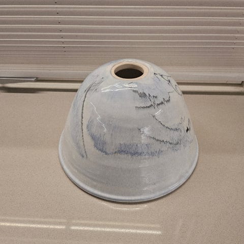 Selger en retro lampekuppel beregnet for taklampe. Den er 15 cm høy og åpningen er 7 cm tvers over. Den har en pittelinen skade helt øverst, se bilde. Vil ikke bli synlig når den er skrudd fast til sokkel.