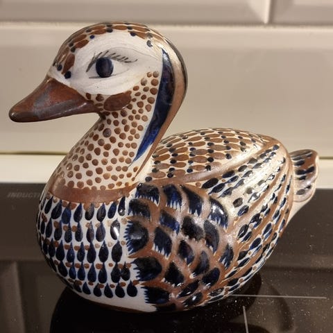Håndmalt and fra Mexico. Den er lagd slik at den kan ligge på hylle og titte ut. Veldig søt og morsom.