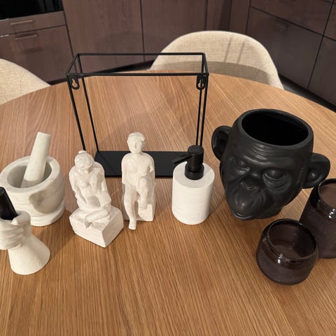Telysholdere, vase, falsk «pinne», fat, puter og gardiner (140x220)