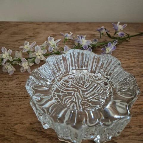 Nydelig lysestake i glass laget i Reims i Frankrike. Diameter øverst ca 9cm, nederst ca 5,5cm. Høyde ca 4,5cm. Vekt 199g. Laget for høye lys, men telys kan også benyttes. Alder ukjent, men er nok kjøpt for et par tiår siden. Lite brukt og lite/ingen bruksslitasje. Staken er merket med REIMS FRANCE på undersiden, men vanskelig å få frem på bildene.