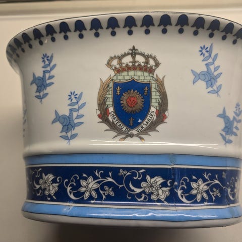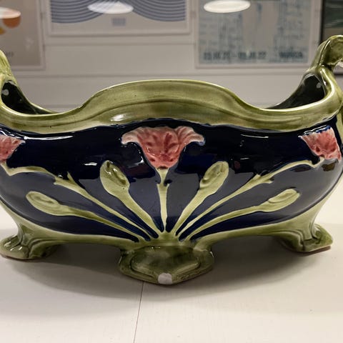 Kjempefin, gammel jardiniere / blomsterkrukke i jugendstil med majolikaglasur.